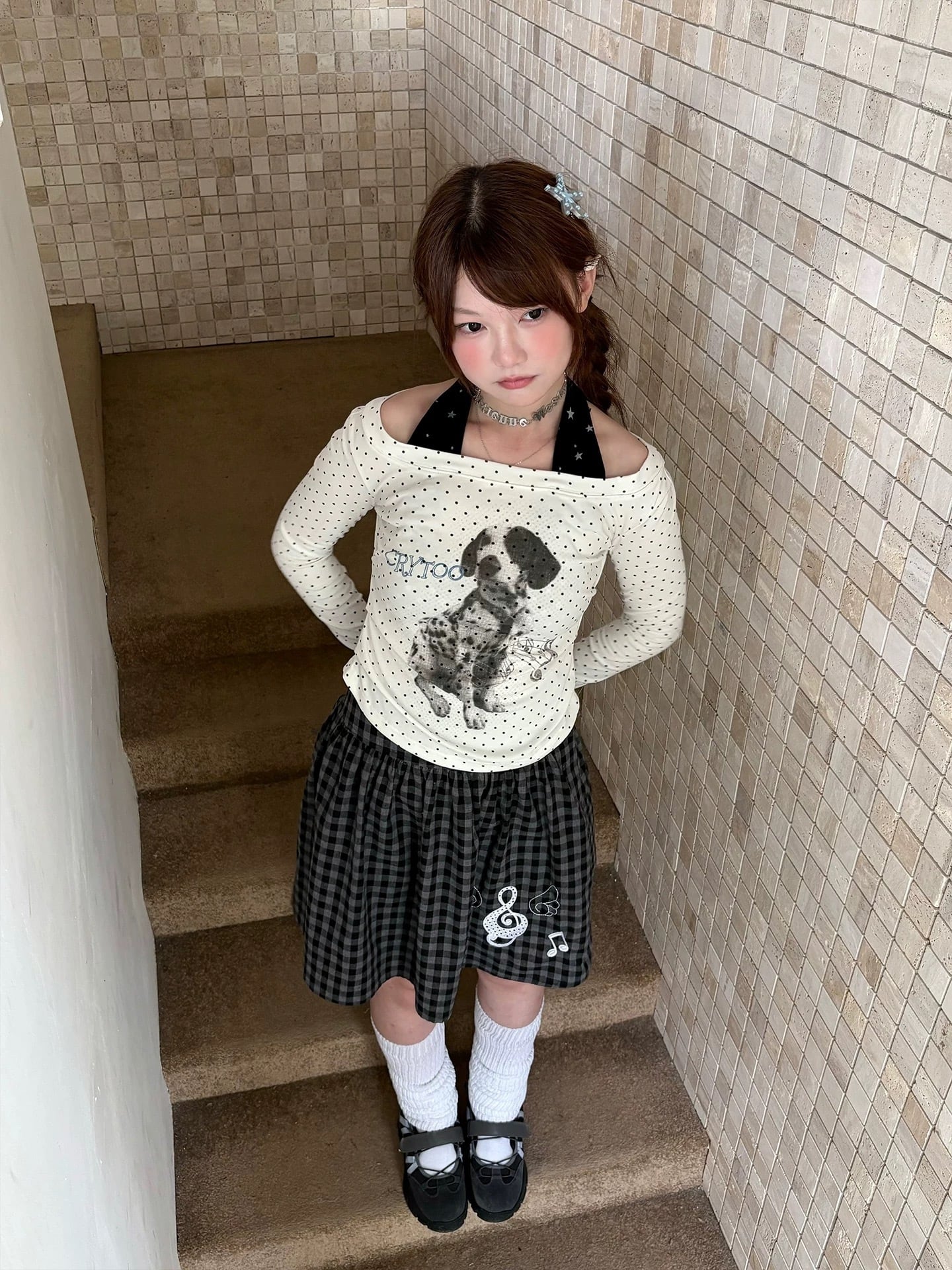 細かなドット柄と、ちょこんと座った子犬のプリントが目を引く一枚⋆˙⟡