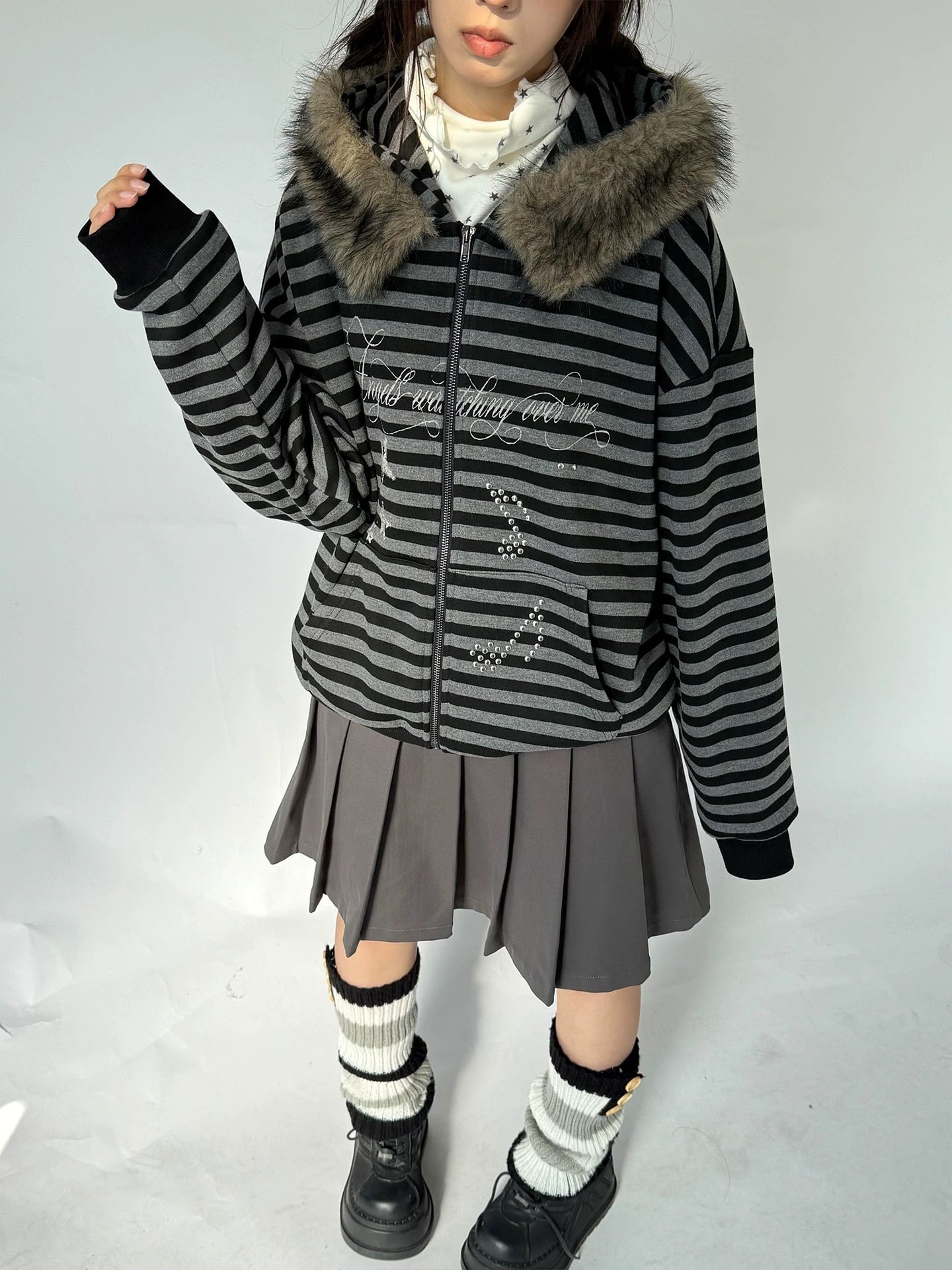 ふわふわのフェイクファーとボーダー柄が可愛いジップフーディ˙⟡