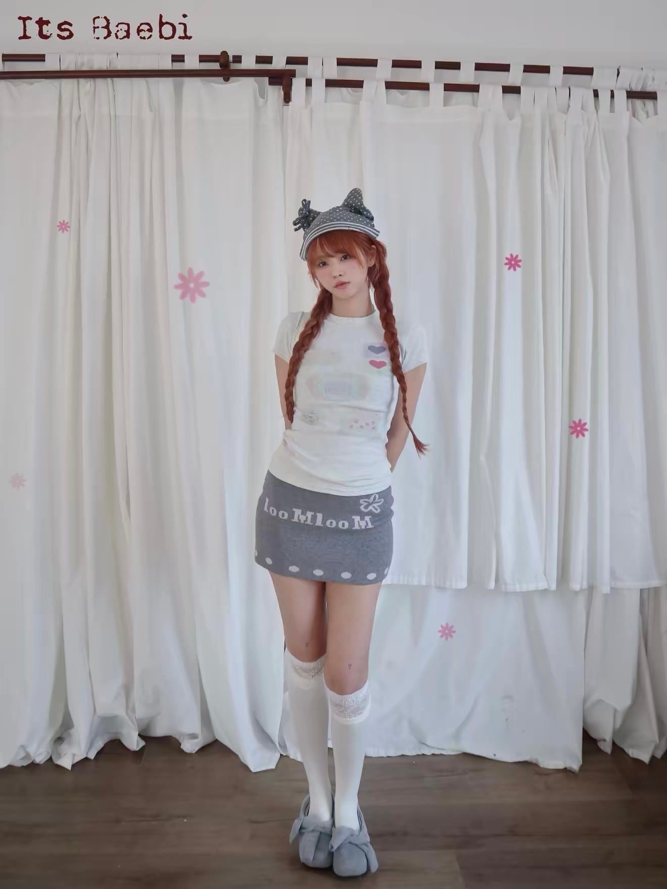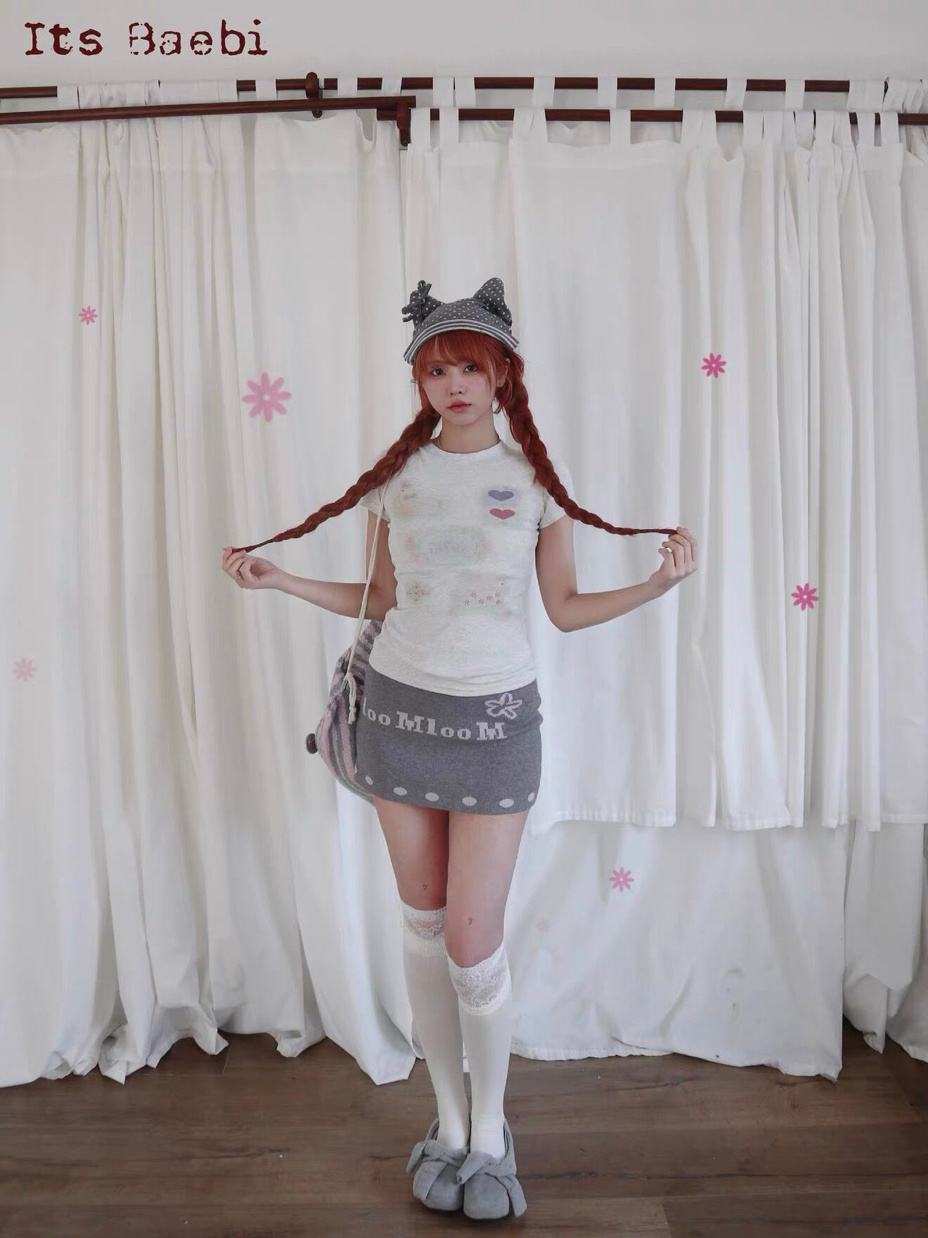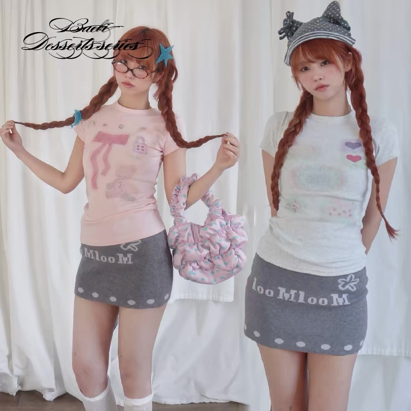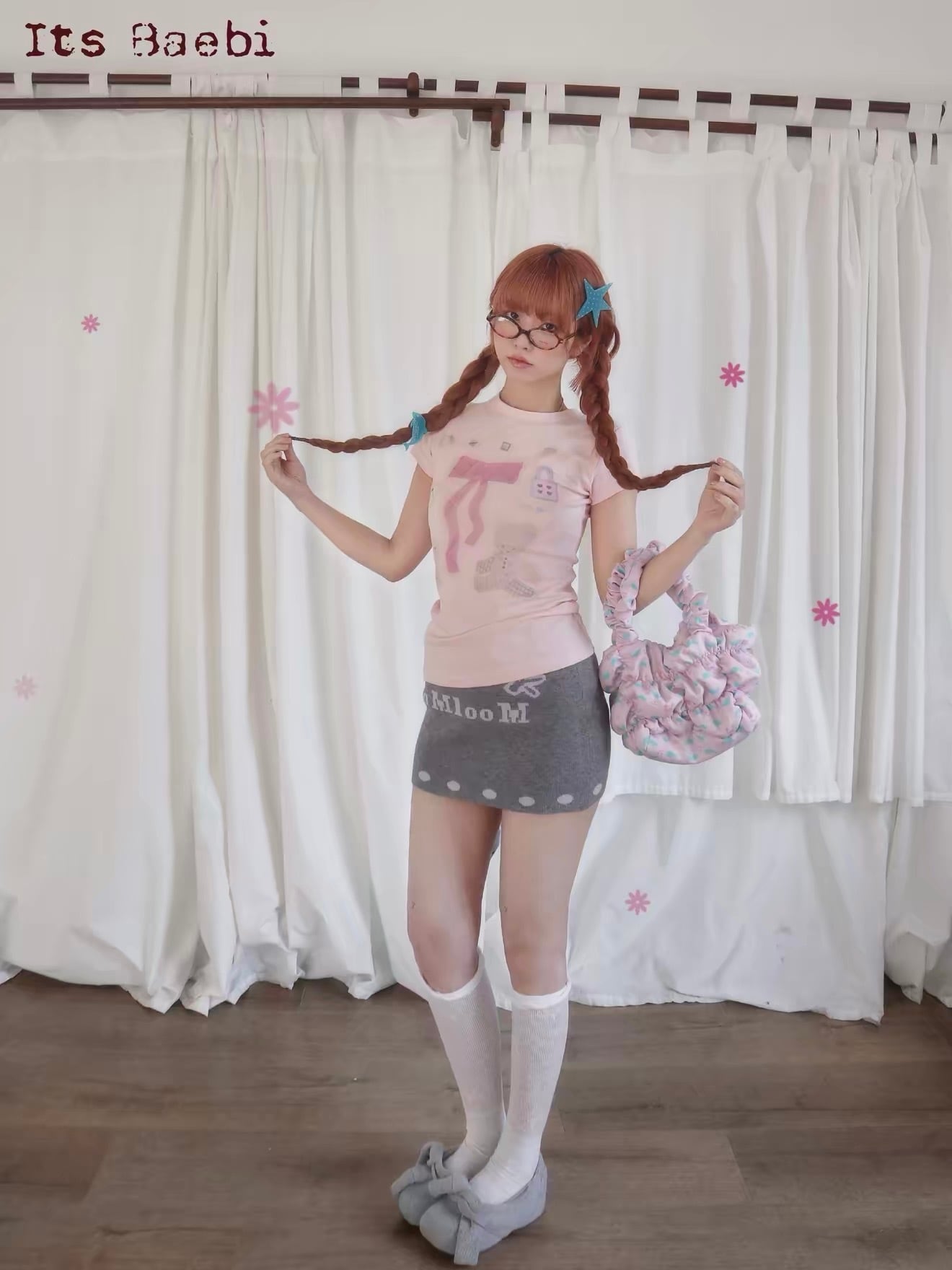 ほんのり透け感のあるやわらかな生地に、リボンやハート、小さなモチーフを散りばめたグラフィックが重なり、淡くにじむような表情に仕上げられています⋆˙⟡