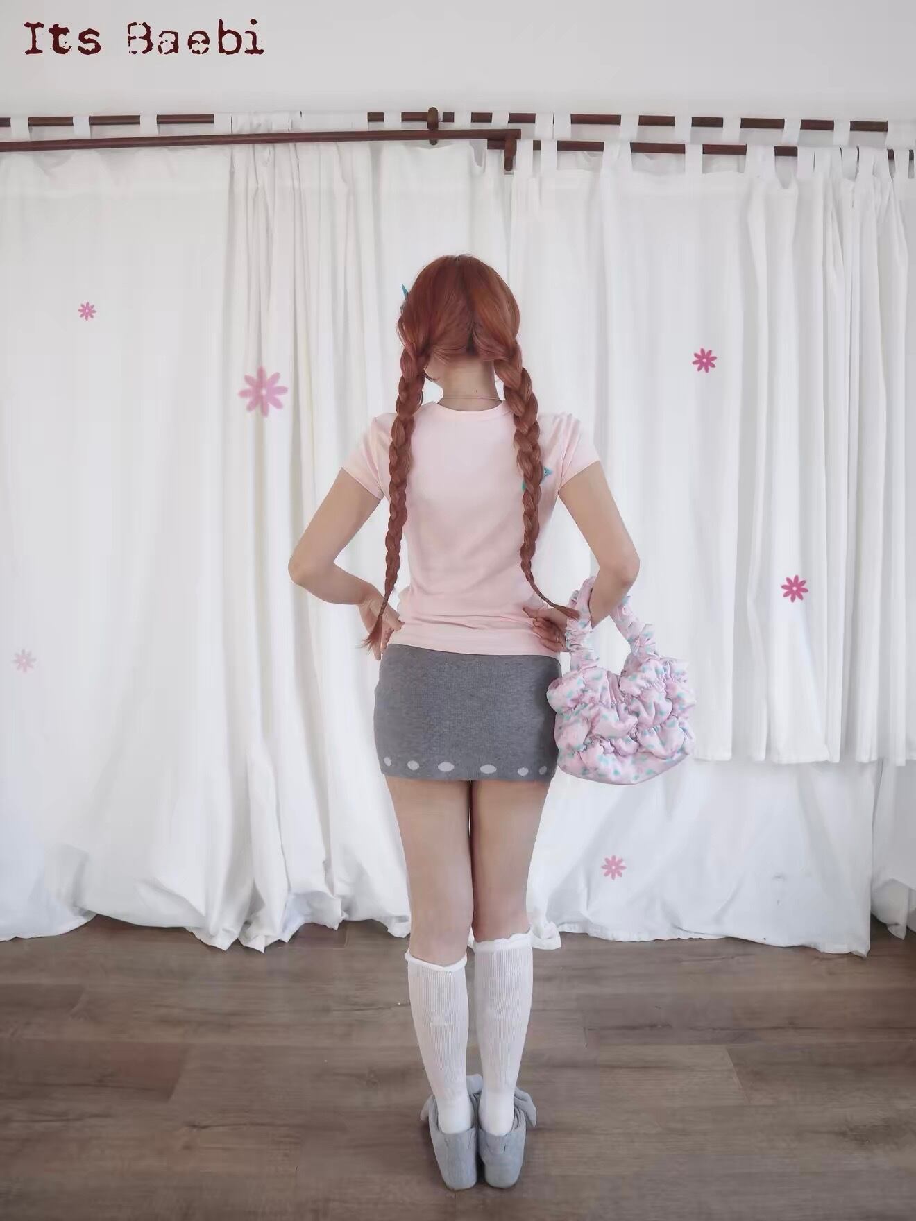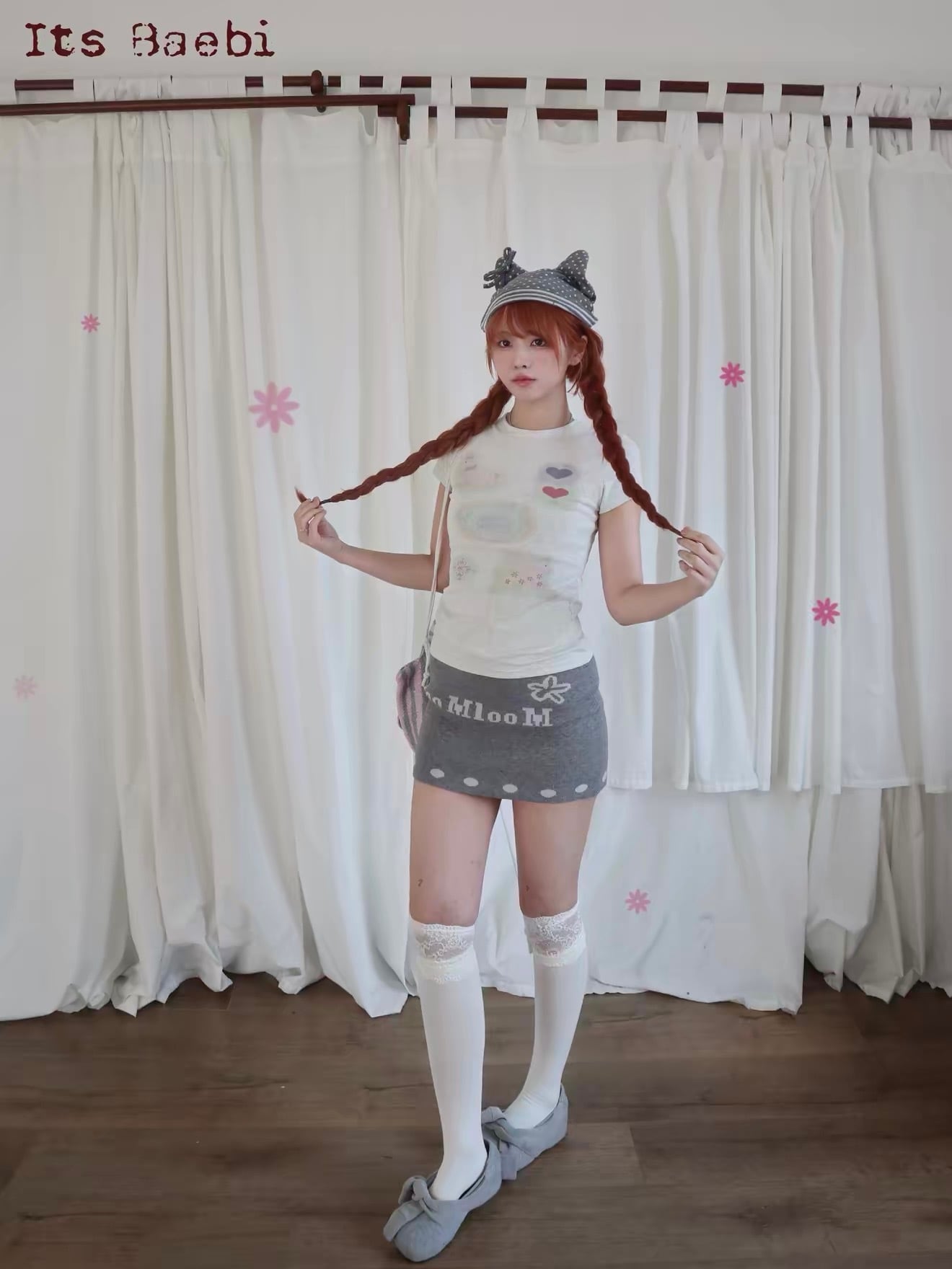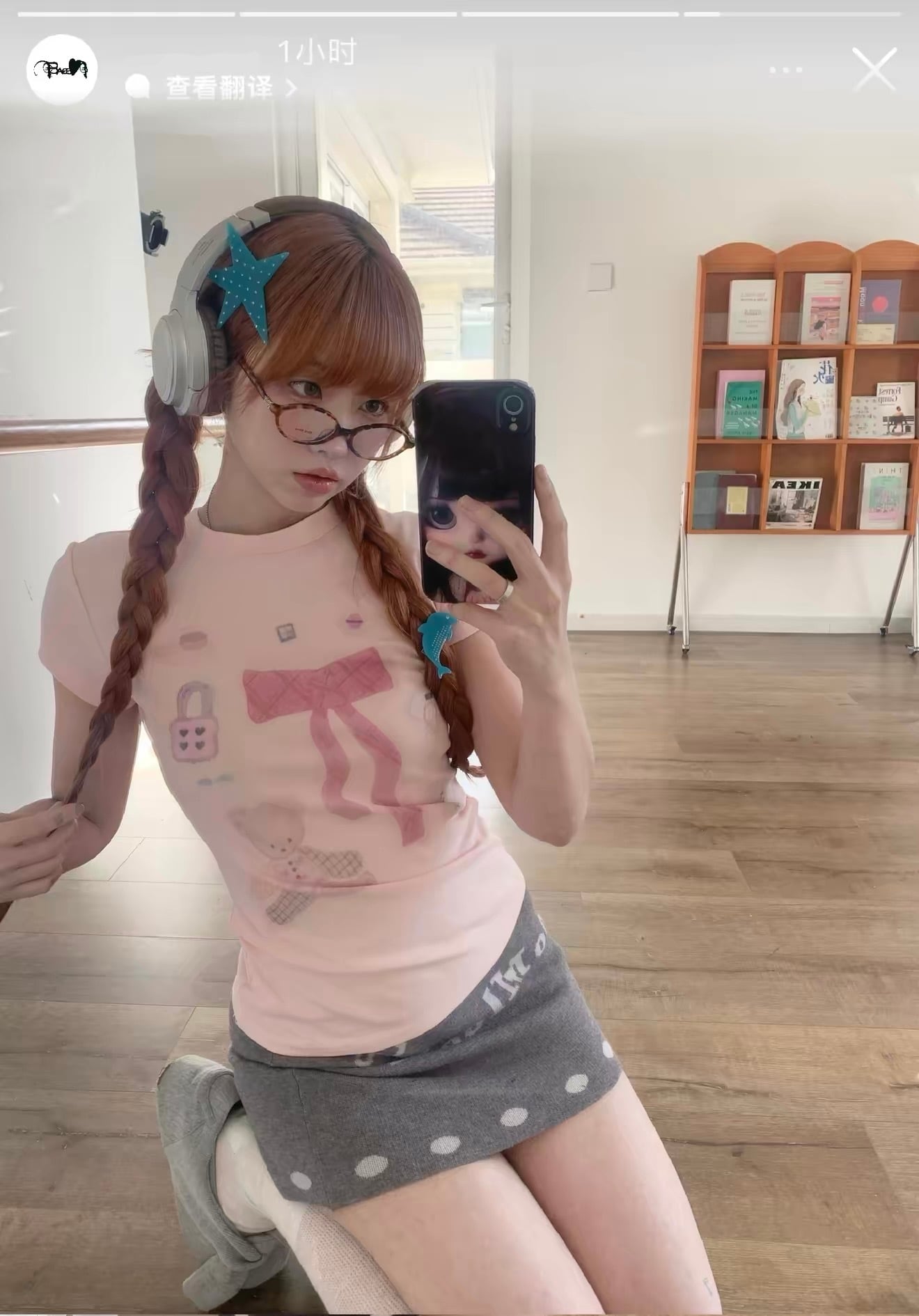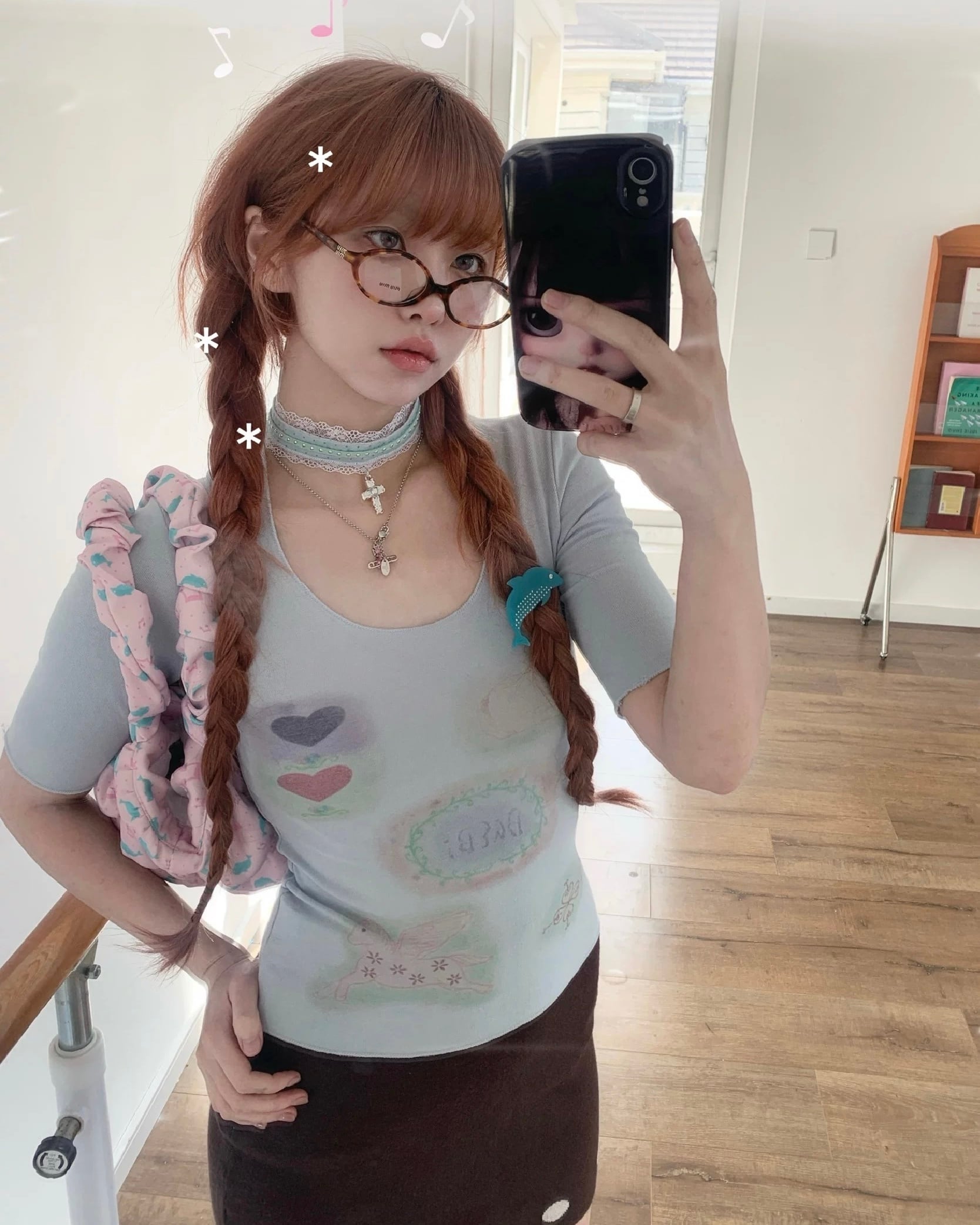 ほんのり透け感のあるやわらかな生地に、リボンやハート、小さなモチーフを散りばめたグラフィックが重なり、淡くにじむような表情に仕上げられています⋆˙⟡