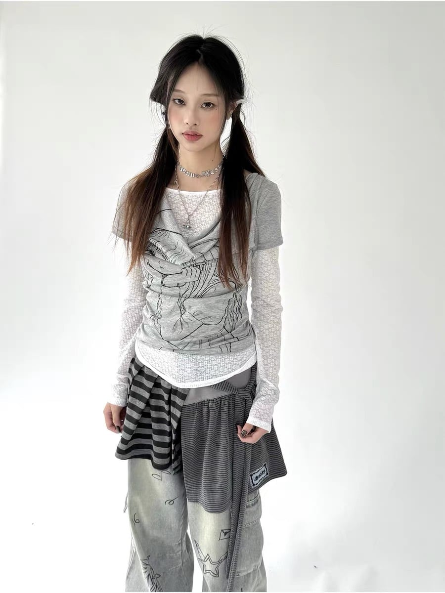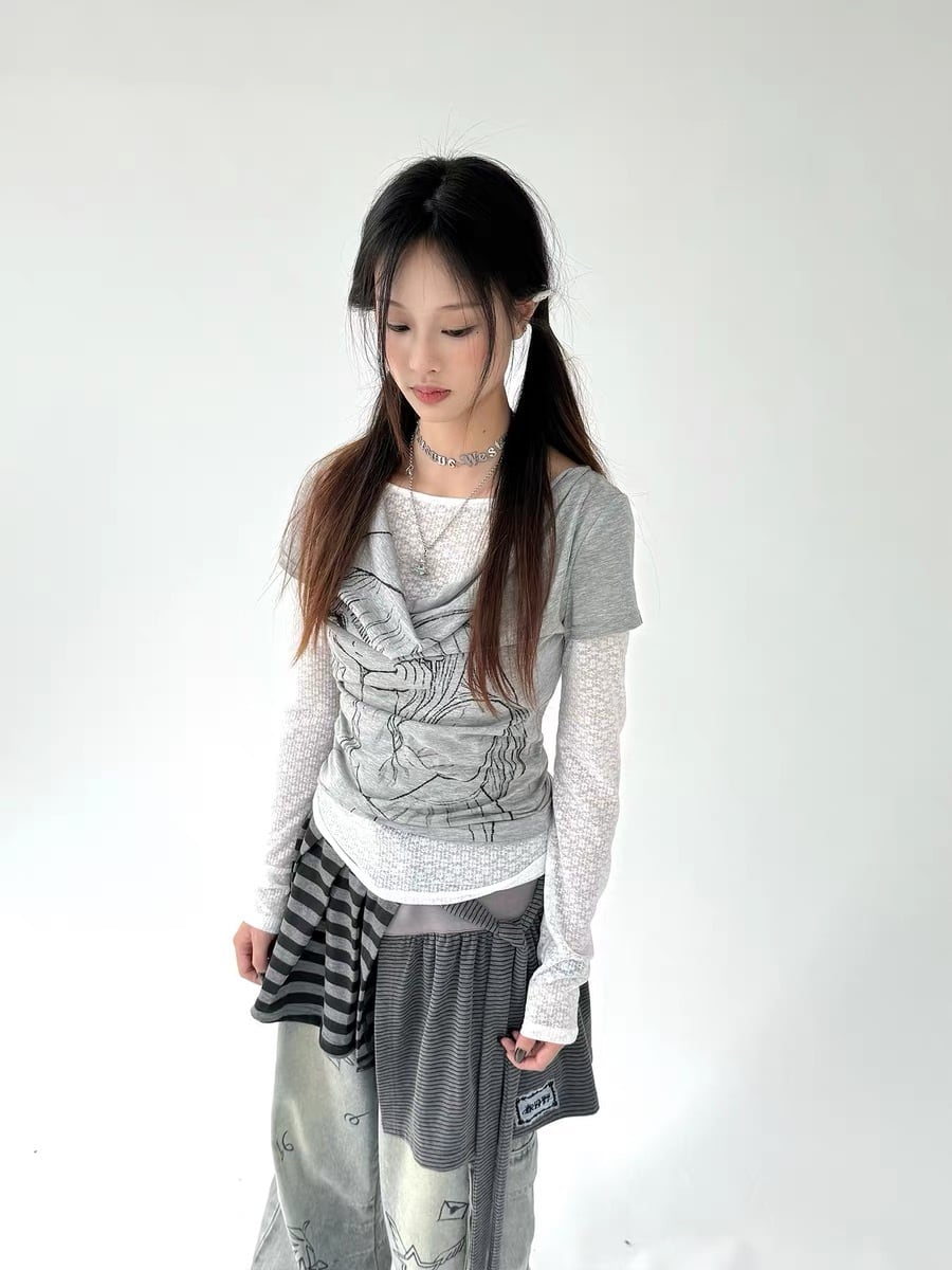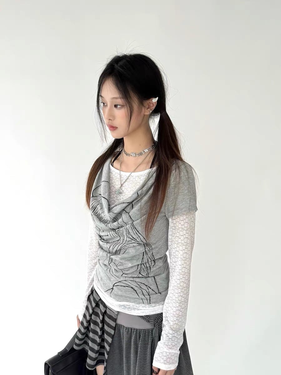 [春日野too] Lace Layered Draped Long Sleeve Top