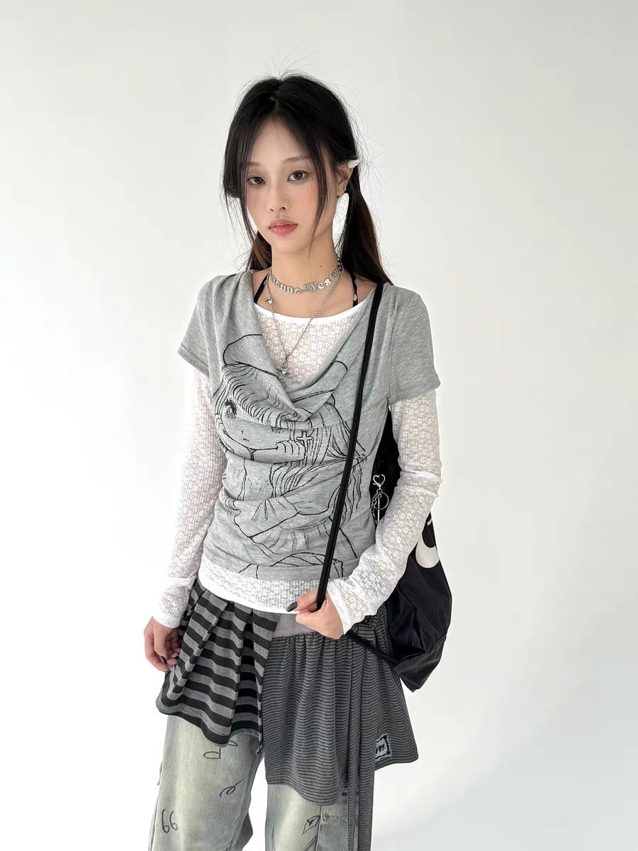 グレーのトップスと透け感のあるインナーのコントラストで奥行きが生まれ、